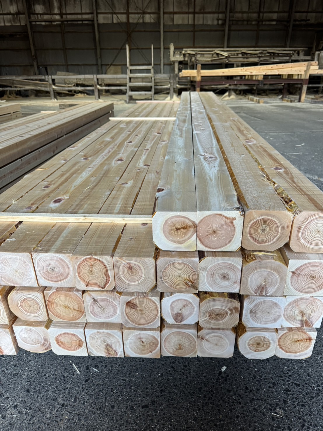 直径が細いため通常は活用されにくい丸太を、9センチ角から10.5センチ角といった寸法に加工し、建築材や土木資材として活用できる形へと仕上げています。