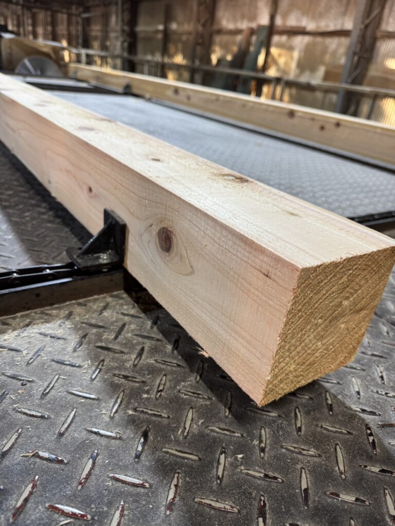 工場の中で力強く稼働しているこの機械で、原木の状態を見極めながら一本一本ていねいに製材しています。木の太さや曲がり、年輪の詰まり具合を確認し、その木にとっていちばん無理のない取り方を選びます。ただ角材にするのではなく、用途や強度を考えながら加工することを大切にしています。