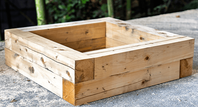 木枠で土を囲む家庭菜園用花壇、通気性良く育てやすいガーデンアイテム。