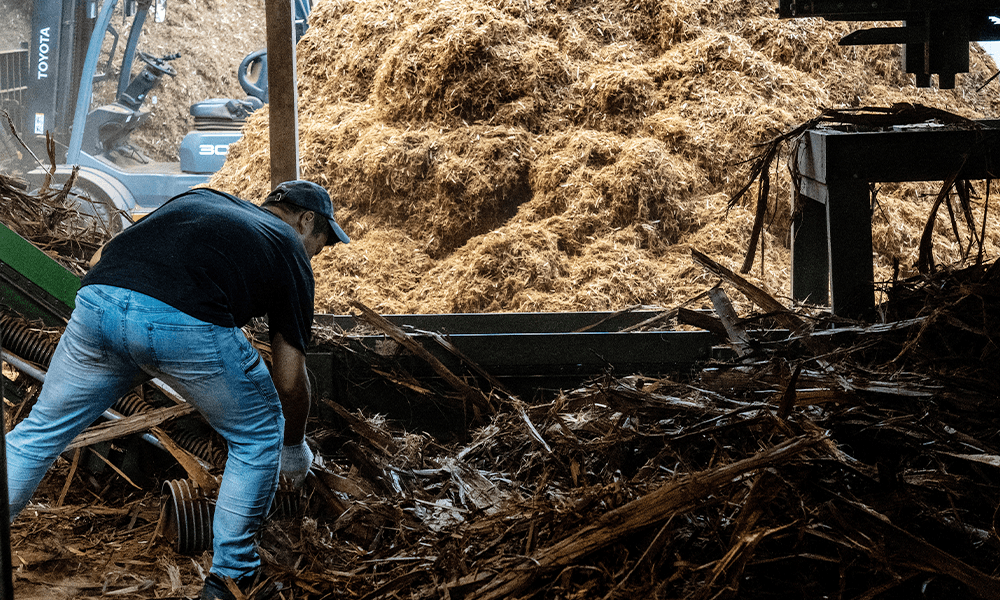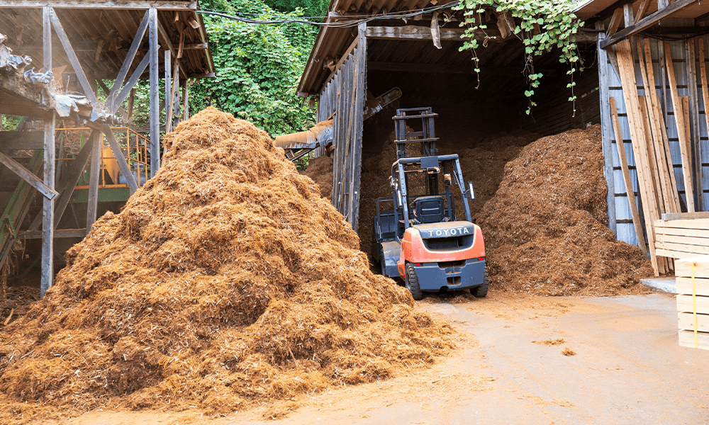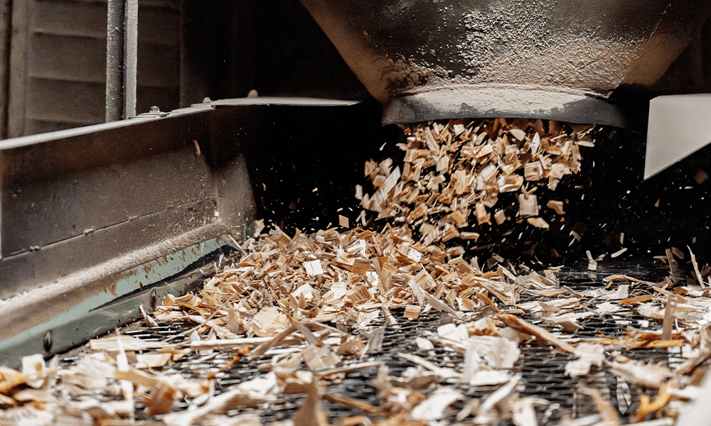 加工後に残る木片や短い材はチップ化され、再生可能エネルギーであるバイオマス燃料に変わります。地域のエネルギー資源として有効に利用され、持続可能な社会づくりに貢献しています。